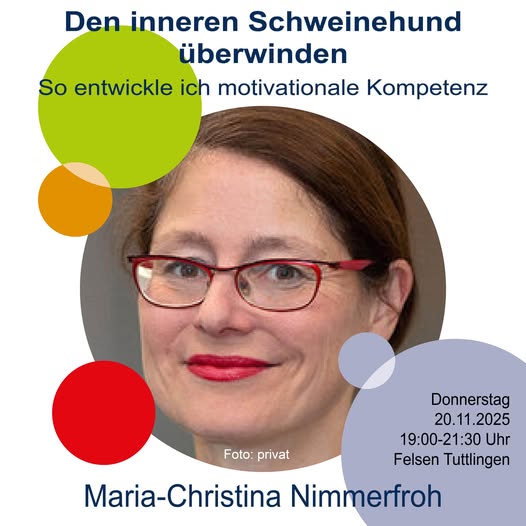 Eine Veranstaltung der vhs Tuttlingen und des Rittergarten e.V.: Der innere Schweinehund – wir kennen ihn alle! Er blockiert unsere Ziele und macht uns das Leben schwer. Aber: Mit den richtigen psychologischen Tricks kannst du ihn an die Kette legen! Diplom-Psychologin und Journalistin Maria-Christina Nimmerfroh zeigt dir, wie du deine motivationale Kompetenz entwickelst und deine […]